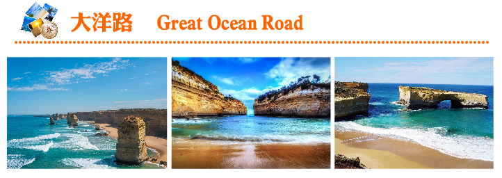 《大洋路 Great Ocean Road》全長 273 公里、沿南澳洲海岸蜿蜒而過,是澳洲以至世界聞名的一條公路,沿途可飽覽大自然壯麗的景色,有世界最美的公路之稱。